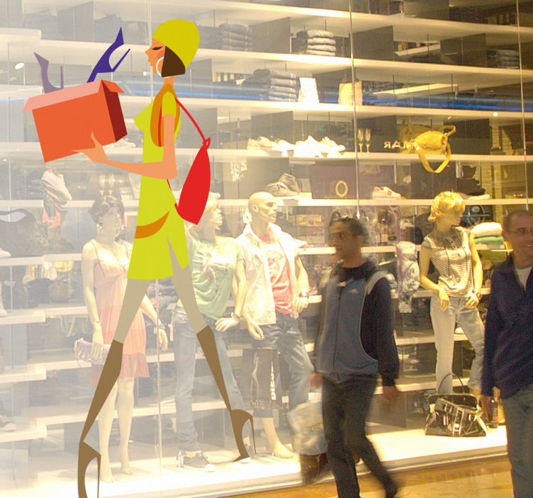 Referência: A52444Um personagem elegante é retratado carregando uma caixa cheia de itens, simbolizando a alegria das compras. O traje vibrante e os saltos altos transmitem um senso de estilo e confiança, atraindo a estética do varejo moderno.