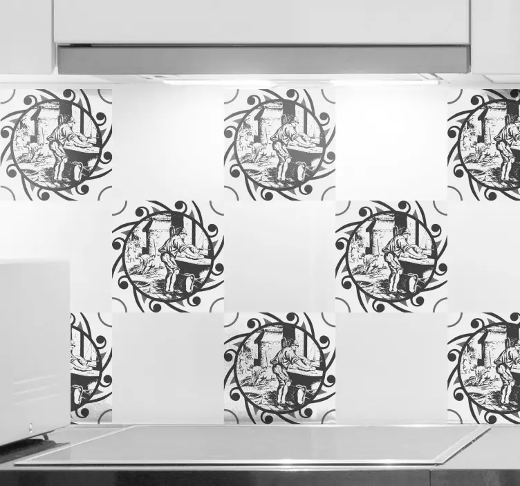 O Autocolante animal cena de artesanato vintage traz um design gráfico inspirador, onde elementos de cozimento e a presença de uma pessoa se entrelaçam em uma telha artisticamente gravada. Este produto, em preto e branco, é um resumo perfeito de arte e funcionalidade, ideal para quem busca dar um toque especial aos seus espaços!