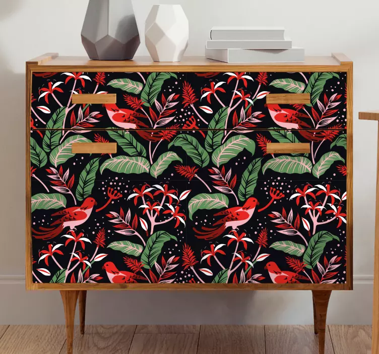 O Autocolante animal conceito floral tropical é a escolha perfeita para quem busca um design gráfico vibrante e cheio de vida! Com um estilo colorido, este autocolante apresenta folhas exuberantes, pássaros encantadores, e um toque de mobiliário que traz a natureza para dentro de casa. Os tons de vermelho e verde harmonizam-se de forma a criar um ambiente tropical e florido, ideal para padronizar a decoração e trazer um sopro de frescor e alegria aos teus espaços.