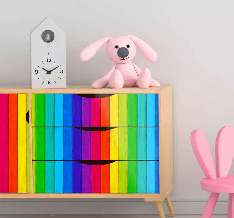 Descobre a beleza do Autocolante animal linhas verticais vibrantes, um produto com design gráfico que transforma qualquer espaço! Com um efeito madeira que se assemelha a pranchas de madeira, este autocolante multicolorido é perfeito para dar um toque vibrante ao teu mobiliário. As listras em arco-íris criam um padrão único que vai deixar a tua decoração muito mais alegre e original.