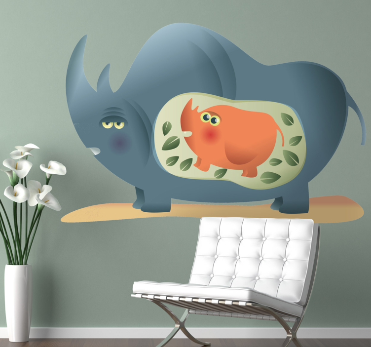 Descobre o nosso Autocolante animal selvagem ilustração de animal brincalhão, um produto que traz à tua decoração uma dose de alegria e criatividade! Com um design gráfico encantador que apresenta um rinoceronte brincalhão ao lado da sua mãe grávida, rodeados por folhas coloridas, este desenho animado caprichoso é perfeito para dar vida a qualquer ambiente. A sua palete de cores vibrantes promete transformar espaços comuns em lugares cheios de charme e personalidade!