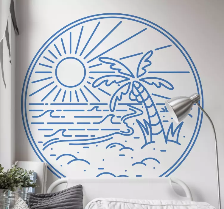 Transforme o teu espaço com o Autocolante animal vista da costa tropical, um design gráfico vibrante que captura a essência de uma paisagem tropical. Este autocolante apresenta um círculo encantador com uma praia ensolarada, palmeiras balançando à beira-mar, um desenho de contorno que exalta o sol, o mar e as ondas, criando uma atmosfera de natureza exuberante!