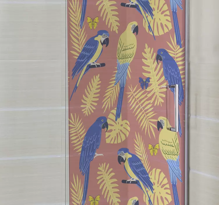 Transforma o teu espaço com o Autocolante cabina duche padrão de papagaios coloridos, que traz um design gráfico vibrante e tropical! Com elementos como araras, folhas exuberantes, borboletas e papagaios em tons de amarelo e azul, este autocolante é uma verdadeira celebração da natureza, perfeito para dar vida à tua porta do chuveiro. O padrão frondoso e alegre enche o ambiente de cor e energia, criando um refúgio relaxante no teu banho!