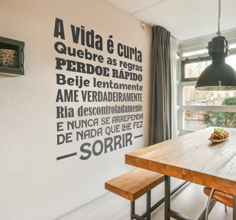 Referência: A39315O autocolante de lar a vida é curta é um produto com design gráfico que vai trazer uma dose extra de motivação para a sua casa! Com frases motivacionais em português, esse autocolante é perfeito para decorar qualquer ambiente. As regras da vida estão presentes nesse autocolante, que possui um design minimalista e moderno. Feito com materiais de primeira qualidade, o autocolante tem acabamento acetinado, o que garante cores vibrantes sem reflexos indesejados. Com gramatura de 80 microns, ele é resistente e lavável, podendo ser limpo facilmente com um pano úmido e sabão neutro. Além disso, o autocolante tem durabilidade de 8 a 10 anos e pode ser aplicado em qualquer superfície plana. Personalizamos o tamanho de acordo com as suas preferências, para que você tenha um produto único e exclusivo. A instalação é muito fácil e, se desejar, você pode adquirir uma espátula para auxiliar no processo. Aproveite para deixar a sua casa mais inspiradora com o autocolante de lar a vida é curta!