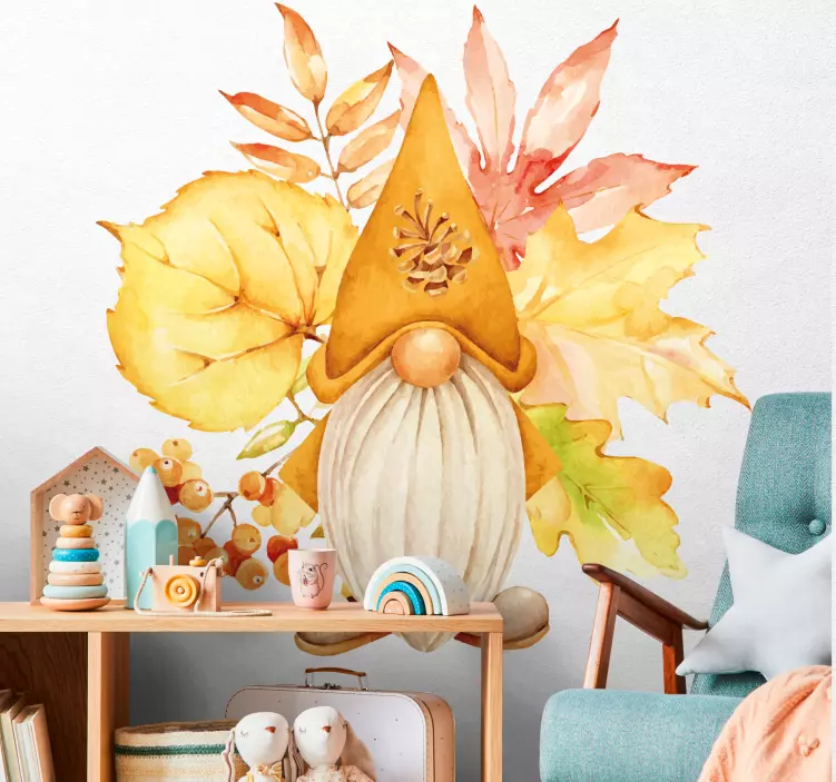 Adorna a tua casa com o encantador Autocolante decorativo gnome de outono, que traz um design gráfico deslumbrante inspirado na aquarela! Com a imagem de um gnomo rodeado por folhas vibrantes que capturam a essência da natureza e do outono, este autocolante é a escolha perfeita para quem deseja um toque mágico na decoração. A sua palete de cores outonais transforma qualquer ambiente, tornando-o acolhedor e cheio de charme!