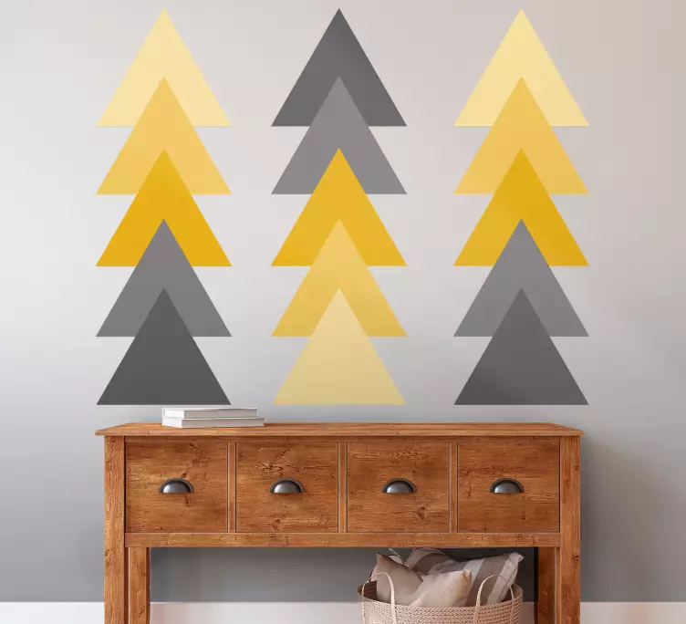 O autocolante geométrico com arranjo triangular é uma peça de design gráfico que une modernidade e estilo. Com seus elementos como setas, flechas e triângulos, este produto traz uma geometria fascinante em tons de amarelo e cinza, criando um padrão decorativo que transforma qualquer espaço. É a escolha perfeita para quem deseja padronizar a decoração de forma inovadora e cativante!