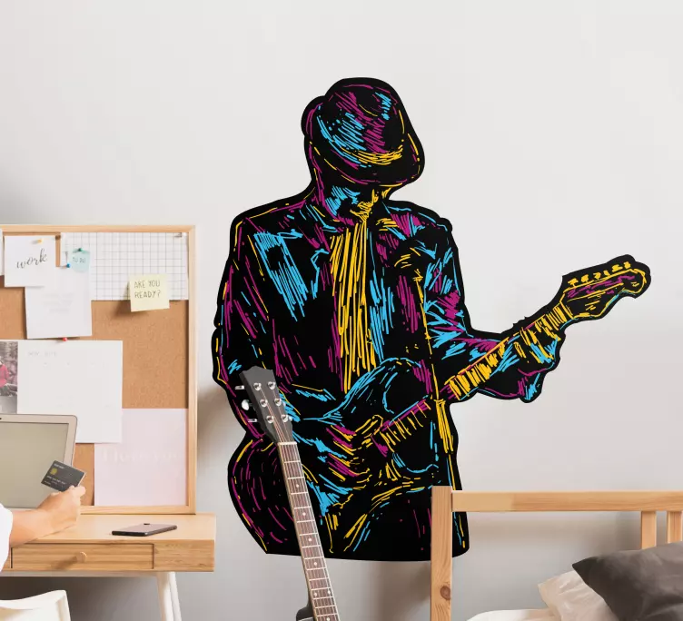 Transforma o teu espaço com o incrível autocolante musical silhueta colorida de guitarrista, que traz um design gráfico vibrante e cheio de personalidade! Com uma ilustração única de um guitarrista, este autocolante captura a essência da música e dos instrumentos musicais, como o violão e a guitarra elétrica. A sua silhueta colorida e cheia de vida é um verdadeiro rabisco artístico que vai encantar qualquer amante da música e dos músicos!