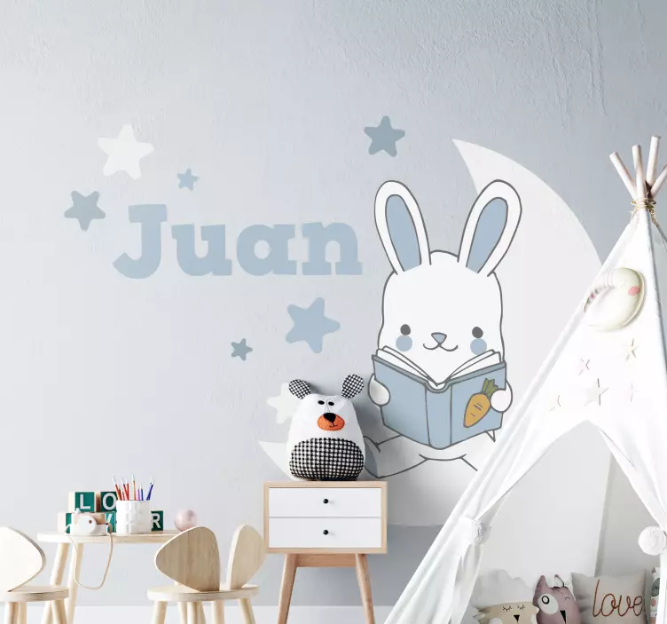 Transforme o quarto dos teus pequenos com o encantador Autocolante para crianças coelhinho lendo livro. Este design gráfico traz uma adorável ilustração de um coelho lendo sob a luz suave da lua, rodeado por estrelas, criando um ambiente mágico e acolhedor. O nome personalizado é uma adição fofa que torna este autocolante único e especial para cada criança. Ideal para qualquer quarto infantil, este produto é uma excelente forma de estimular a imaginação dos pequenos!