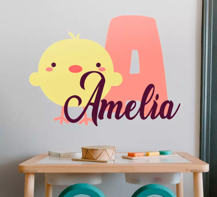 Transforme o quarto dos teus pequenos com o nosso Autocolante para crianças com design de pintinho fofo. Este adorável design gráfico traz um pássaro brincalhão e colorido, com a opção de incluir uma inicial e um nome personalizado. A decoração infantil ganha vida com um toque de desenho animado, tornando o ambiente mais divertido e acolhedor. Este produto é totalmente customizável e foi pensado para encantar e trazer alegria ao quarto infantil.