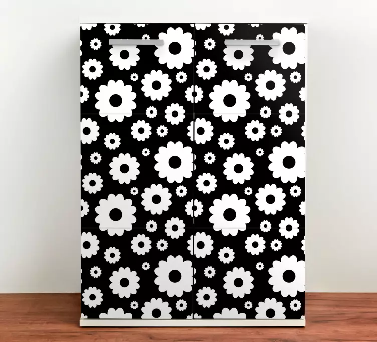 Transforma o teu frigorífico com o nosso Autocolante para frigorífico arte botânica, que apresenta um design gráfico deslumbrante. Este autocolante floral combina elementos de mobiliário e padrões modernos, destacando margaridas em preto e branco. É a escolha perfeita para quem deseja adicionar um toque de estilo e originalidade ao projeto de casa!