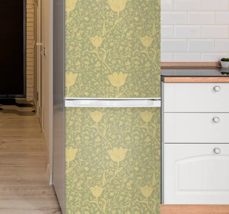 Transforma o teu frigorífico num verdadeiro quadro de arte natural com o nosso Autocolante para frigorífico com design de padrões florais. Este design gráfico elegante combina tons de dourado, verde e amarelo, criando um padrão floral que traz a beleza da natureza para a tua cozinha. As flores vibrantes são perfeitas para padronizar o ambiente, tornando-o mais acolhedor e cheio de vida!