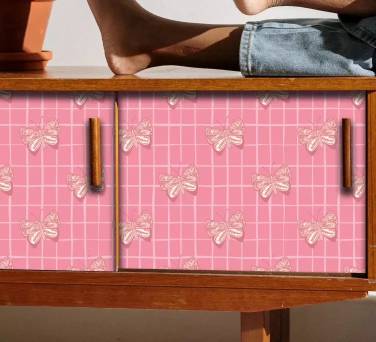 Transforma a tua cozinha com o Autocolante para frigorífico padrão de borboleta rosa, um design gráfico encantador que combina borboletas delicadas e um padrão de rede xadrez. Este produto decorativo em cor de rosa é perfeito para padronizar o mobiliário, trazendo um toque de elegância e alegria ao ambiente!