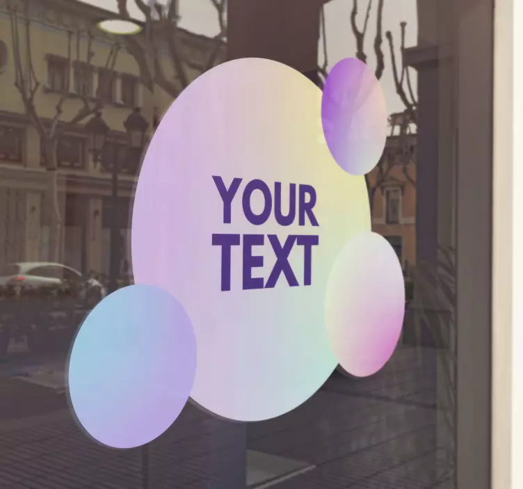 Transforma a tua vitrine com o nosso Autocolante para montras círculos de texto personalizáveis, que combina um design gráfico moderno e colorido! Com um gradiente fluido e um estilo geométrico, este produto permite que exprimas a tua criatividade através de textos personalizados que se destacam. Ideal para quem deseja dar um toque único e vibrante à decoração, ele é perfeito para captar a atenção dos clientes e transmitir a essência da tua marca!