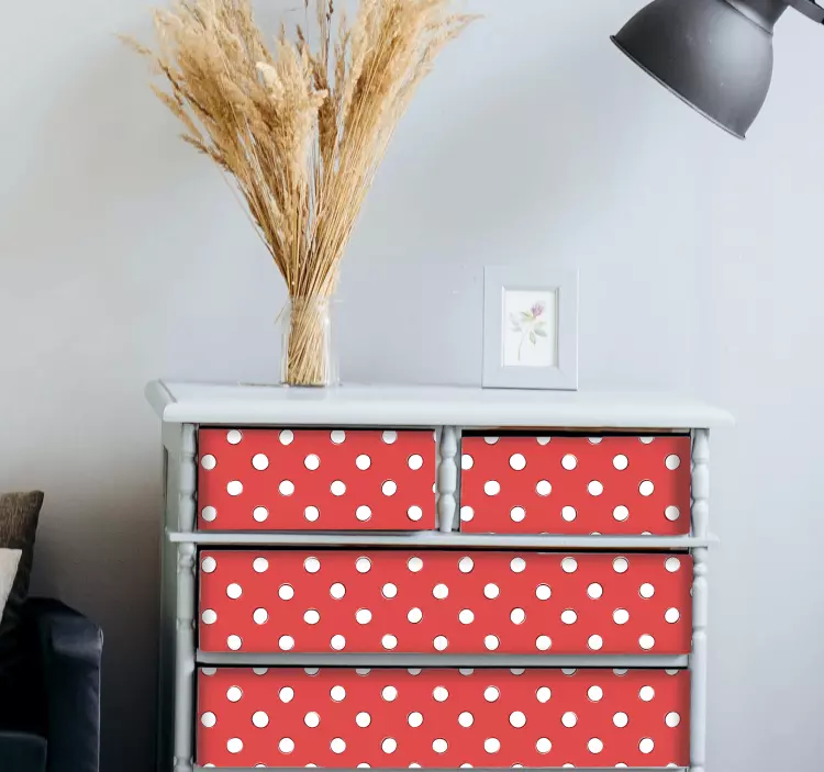 Transforma o teu mobiliário com o nosso Autocolante para móveis com estampa de bolinhas, que traz um design gráfico encantador! Com a sua estampa de bolinhas em vermelho e branco, este autocolante combina a clássica polca com padrões texturizados, permitindo padronizar gavetas e outros móveis de forma alegre e moderna.
