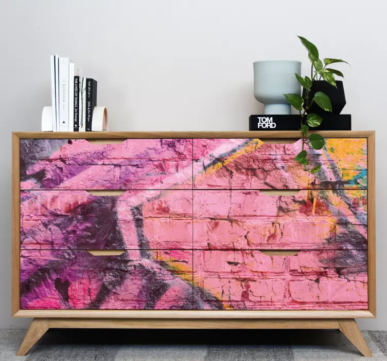 Transforma o teu espaço com o Autocolante para móveis com estilo colorido e marcante, que traz um design gráfico vibrante e envolvente! Com elementos que evocam uma parede de tijolos, grafite, graffiti, e arte urbana, este autocolante é uma explosão de cores que inclui tons de cor de rosa e padrões geométricos. A sua textura artística alia-se à estética de pichação, tags, e murais, proporcionando um visual único e ousado para o teu mobiliário!