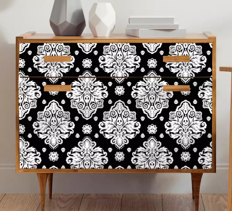 Transforma o teu espaço com o nosso Autocolante para móveis com padrão elegante, que combina um design gráfico impressionante que inclui elementos de mobiliário, caveiras, flores, damasco e um padrão ornamentado. Combinando as cores preto e branco, este autocolante traz um padrão ornamentado que se encaixa perfeitamente no estilo moderno de qualquer design de móveis e interior de casa!