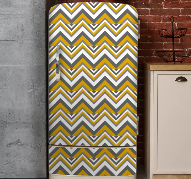 O autocolante para móveis em estilo chevron é a escolha perfeita para quem busca um design gráfico que une modernidade e estilo. Com um padrão nórdico de ziguezague e triângulos, este autocolante combina cores vibrantes como o amarelo e o cinzento, trazendo um toque contemporâneo e elegante aos teus móveis, frigorífico e outras superfícies. Torna qualquer ambiente mais atraente e harmonioso!