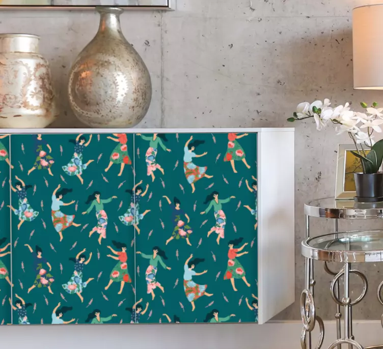 Transforma o teu espaço com o Autocolante para móveis padrão de movimento alegre, um design gráfico vibrante que captura a essência da celebração! Com figuras de mulheres dançando de forma dinâmica e colorida, este autocolante traz à tona a alegria da dança e a padronização do mobiliário, criando uma atmosfera festiva e inspiradora em qualquer ambiente.