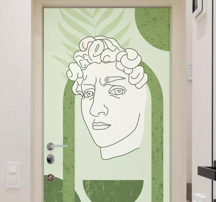 Descubra a beleza do autocolante para porta arte de rosto contemporânea, uma peça que transforma qualquer espaço com seu design gráfico inovador. Com uma representação da famosa estátua de David, esta escultura minimalista traz um toque moderno, utilizando tons verdes e formas abstratas que se destacam na arte de linha. Perfeito para quem busca uma decoração única e contemporânea!
