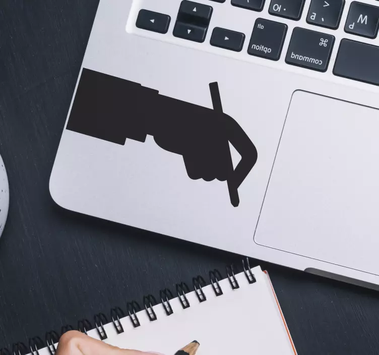 Transforma o teu portátil com o nosso Autocolante para portátil mão segurando lápis, um design gráfico que destaca a silhueta de uma mão escrevendo com um lápis, em uma elegante silhueta negra. Este autocolante é uma verdadeira obra de arte criativa e artística que traz um toque especial ao teu equipamento.