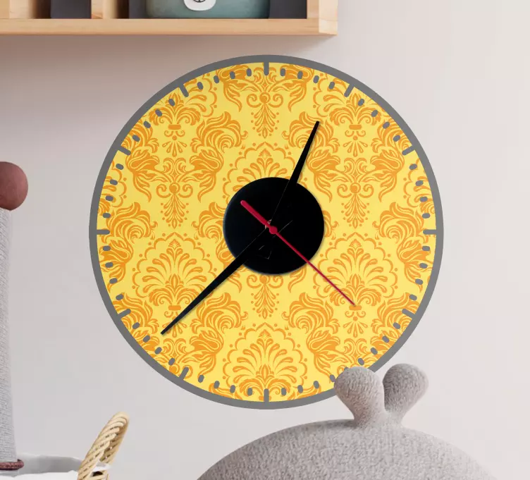 Transforme o ambiente com o nosso Autocolante relógio floral elegante, que traz um design gráfico sofisticado e encantador. Com um padrão de damasco que harmoniza com um toque floral, este adesivo de relógio em tons de amarelo apresenta formas arredondadas, proporcionando uma estética elegante e única para qualquer espaço. É a escolha perfeita para quem busca um elemento decorativo que combine estilo e funcionalidade!