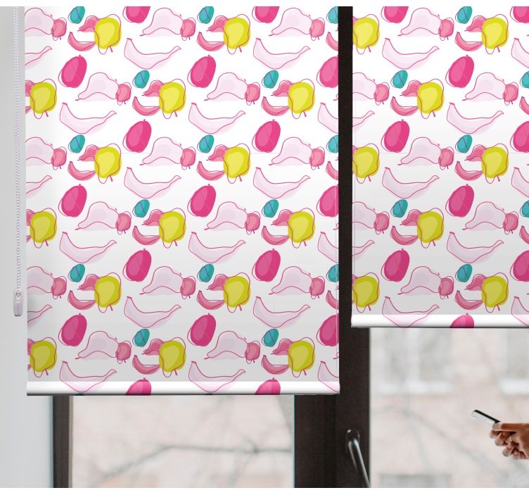 Cortinas de rolo com motivos geométricos coloridos para frutas e