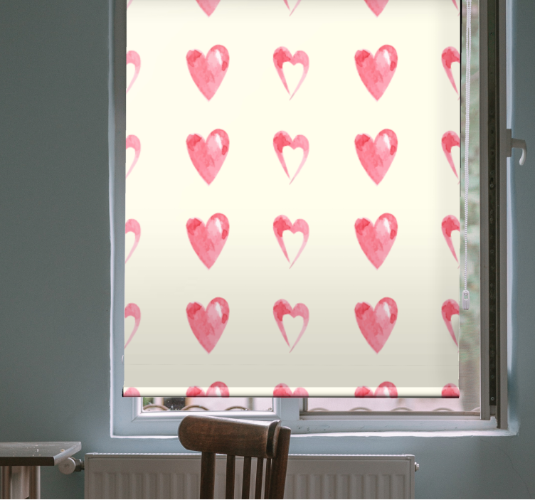 Estores brancas com corações rosa em um padrão.