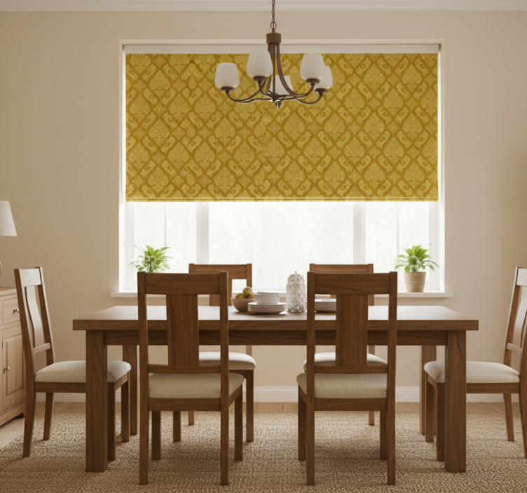 Estore de rolo amarelo com padrão floral intricado