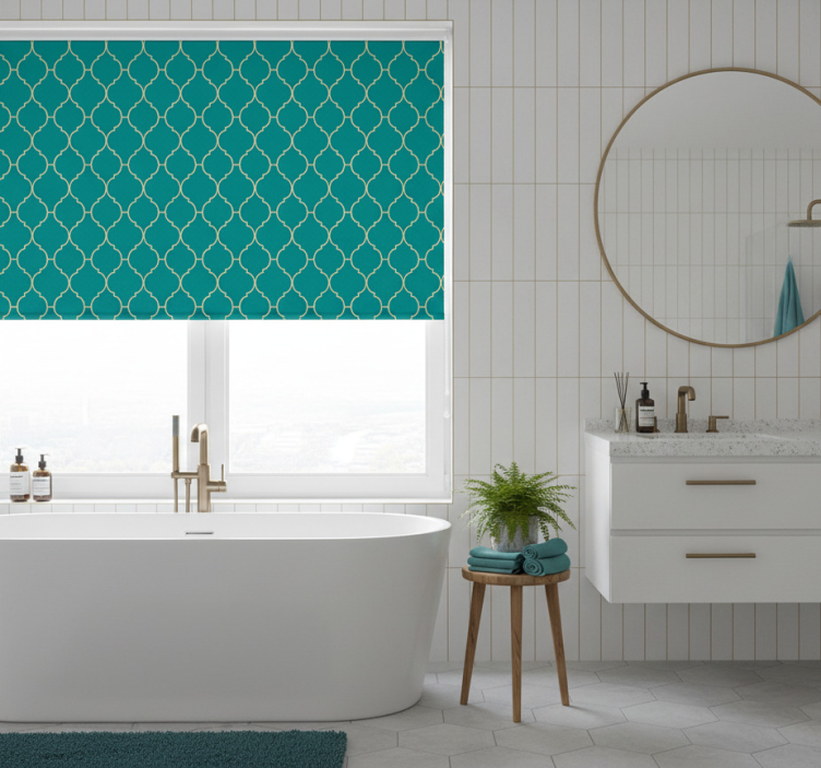 Estore de rolo azul com padrão dourado e turquesa