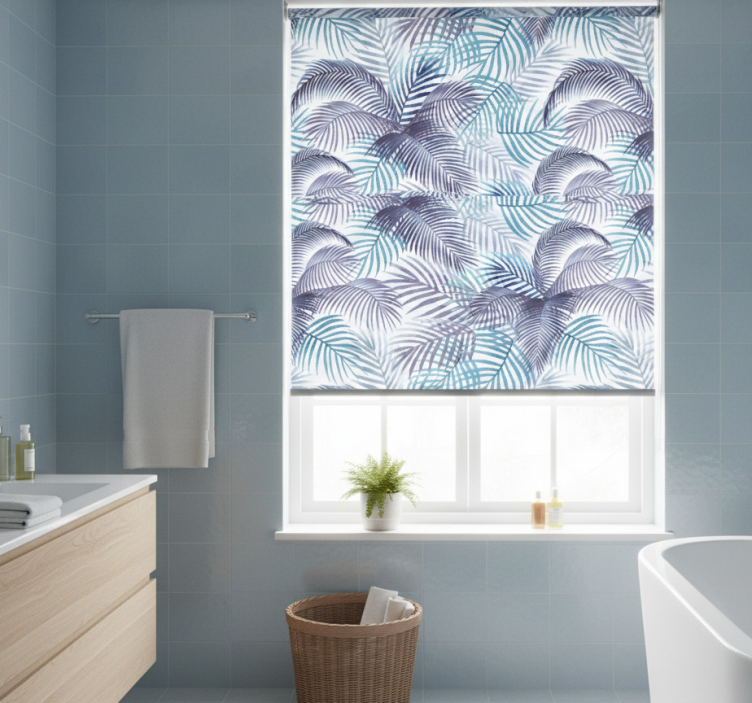 Estore de rolo azul folhas e palmas