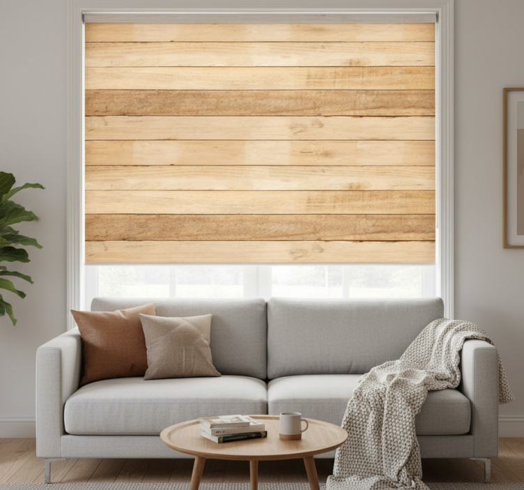 Estore de rolo bege com tábuas de madeira clara
