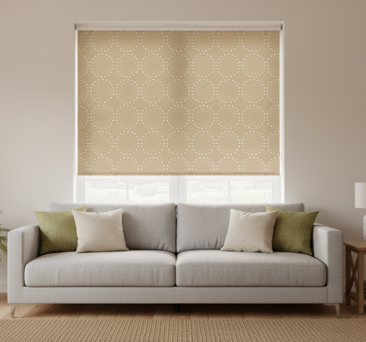 Estore de rolo bege fundo bege claro com círculos brancos