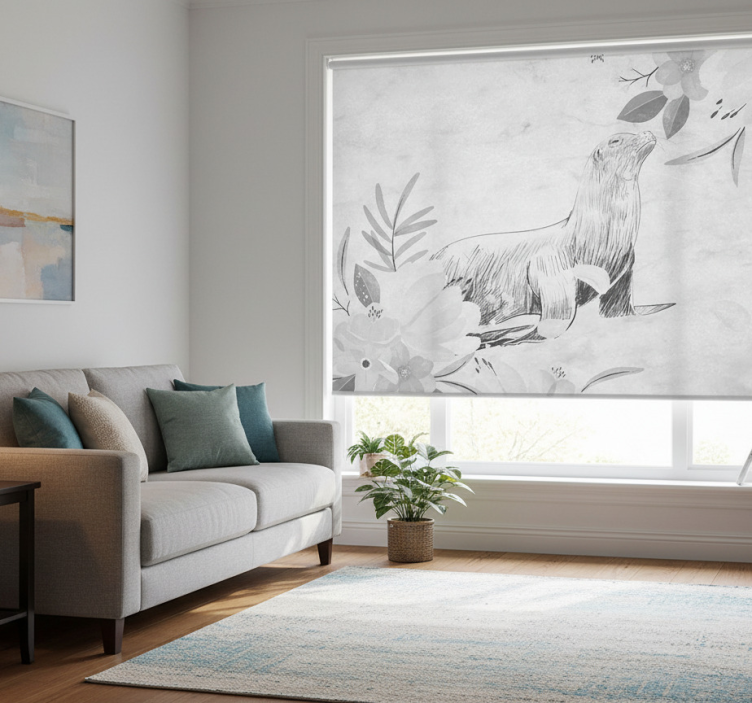 Estore de rolo branco foca cinza nadando e flores