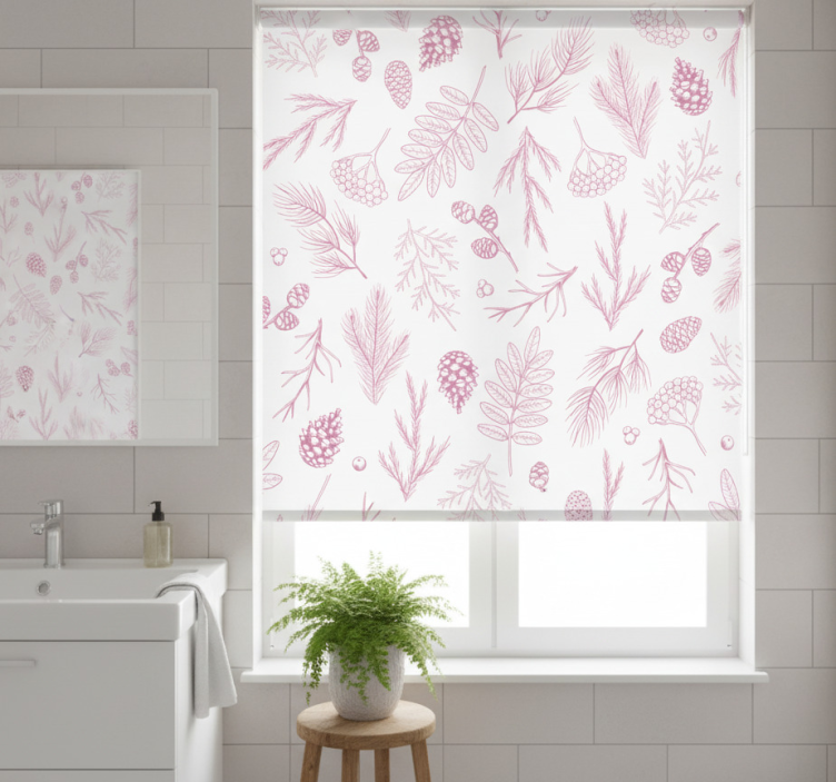 Estore de rolo casa de banho fundo branco com pinheiro rosa
