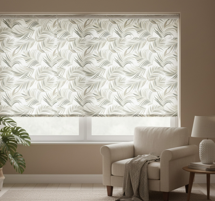 Estore de rolo cinzento com motivos de folhas sofisticadas