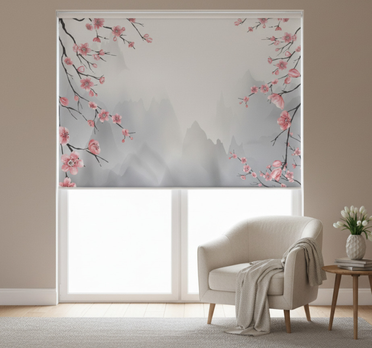 Estore de rolo cinzento flores de cerejeira e montanhas