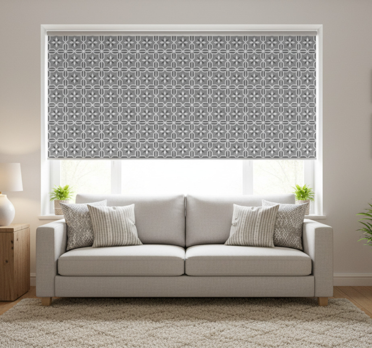 Estore de rolo cinzento geométrico com fundo cinza suave