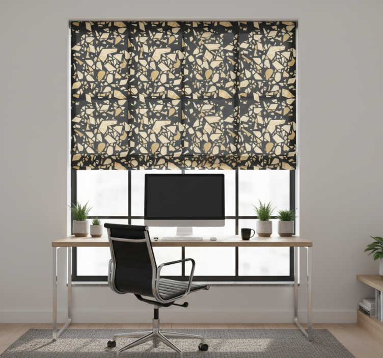 O estore de rolo empresa estilo terrazzo preto e ouro é a solução perfeita para quem deseja transformar a sua casa com um toque de elegância! Este estore não só valoriza a decoração do espaço, como também proporciona privacidade e controle da luz solar. Ao ser utilizado, ele eleva o ambiente, tornando-o mais acolhedor e sofisticado, ideal para qualquer divisão da casa!