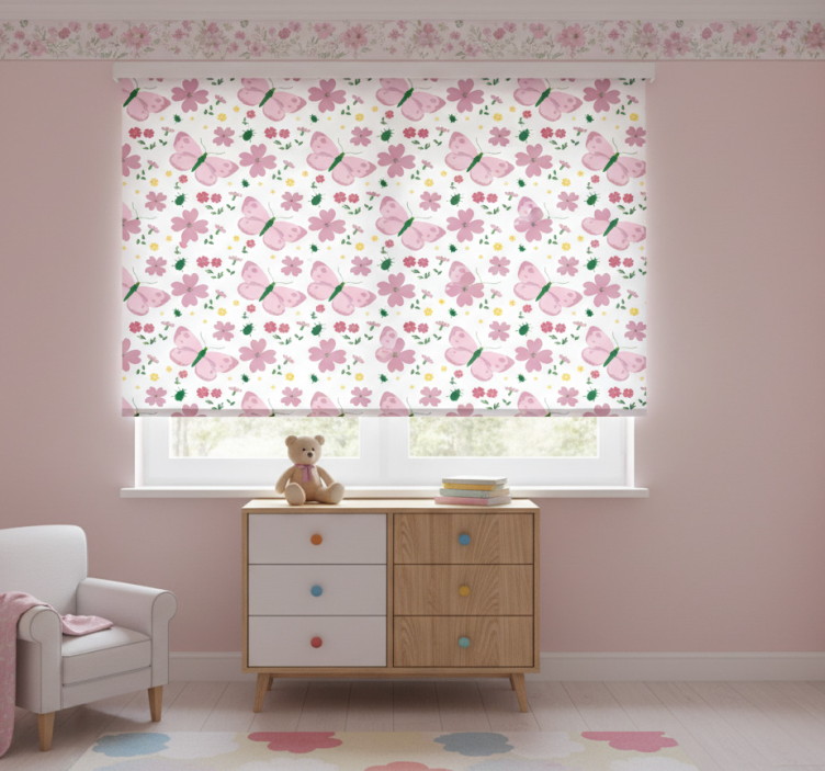Estore de rolo infantil com padrão de flores e borboletas rosas