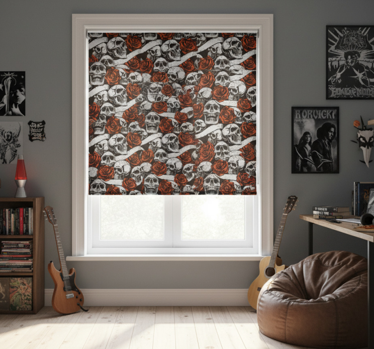 O estore de rolo juvenil caveiras e rosas é a escolha ideal para quem deseja transformar o ambiente! Com um design que cativa e inspira, ele não só embeleza o espaço, mas também proporciona uma atmosfera única e cheia de estilo. A sua beleza gráfica faz dele um elemento decorativo que se destaca, tornando qualquer quarto mais atraente e especial. É uma forma de expressar a personalidade e o gosto do jovem, criando um espaço onde se sentem verdadeiramente à vontade!