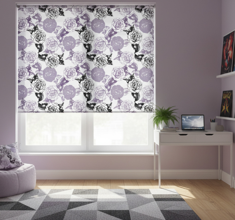 Estore de rolo juvenil com padrão de flores roxas e pretas