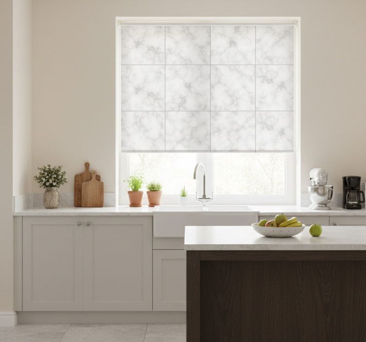 Estore de rolo para cozinha azulejo quadrado branco mármore