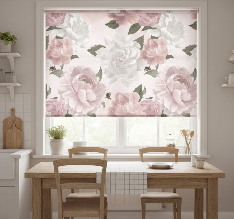 Estore de rolo para cozinha com peônias provençais