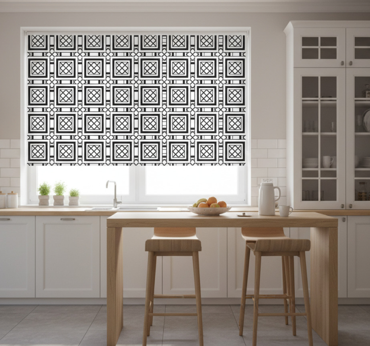 Estore de rolo para cozinha estilo azulejo hidráulico preto