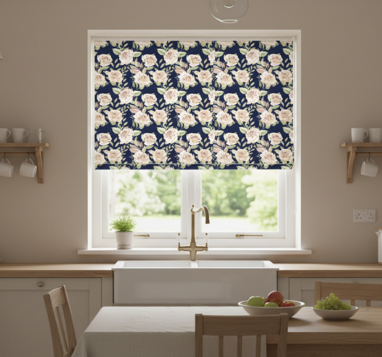 O estore de rolo para cozinha estore de rolo para cozinha padrão rosa vintage sobre fundo azul é a escolha ideal para quem deseja adicionar um toque de personalidade à decoração. Ele transforma as janelas em verdadeiras obras de arte, criando um ambiente que inspira e alegra! Com ele, é possível equilibrar luz e privacidade, permitindo que cada refeição na cozinha se torne uma experiência especial.