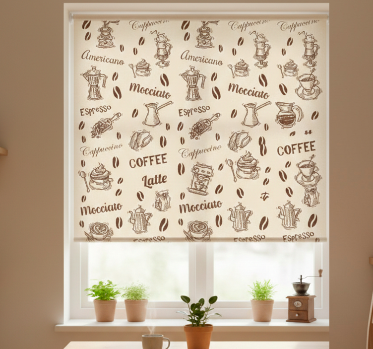 Estore de rolo para cozinha padrões de nomes em café 3d
