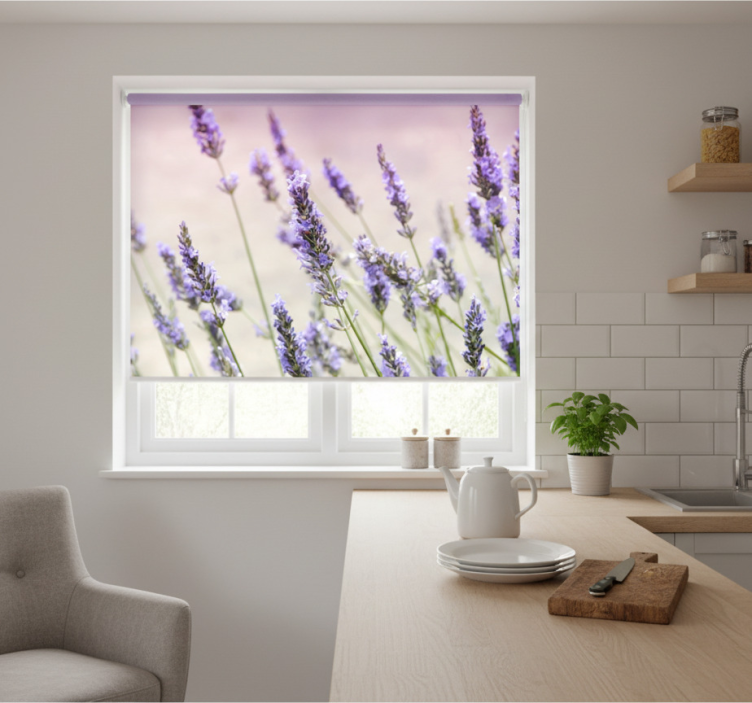 Estore de rolo para cozinha um buquê de flores roxas