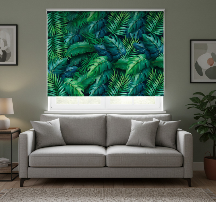 Estore de rolo para sala folhagem tropical elegante