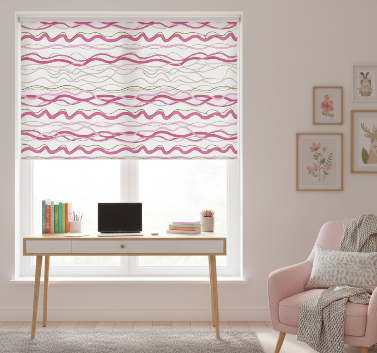 Estore de rolo rosa listras onduladas rosas