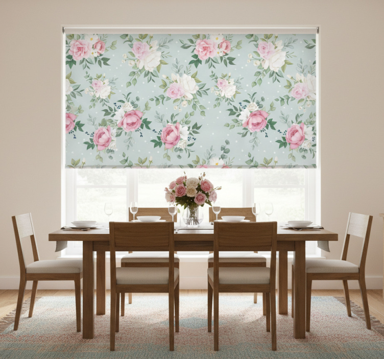 Estore de rolo sala de jantar floral azul e rosa